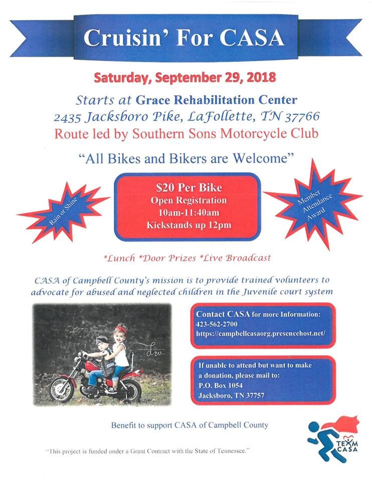 Cruisin' For CASA is a Bike Run led by Southern Sons MC to support CASA of Campbell County. The event will take place on 09/29/2018 at 10:00 am at Grace Rehabilitation Center located at 2435 Jacksboro Pike, LaFollette, TN 37766.